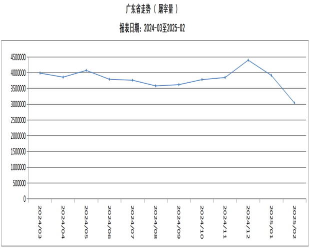 据对全省304家在产生猪定点屠宰企业跟踪监测,2月份共屠宰生猪3032926头,环比下降22.42%。