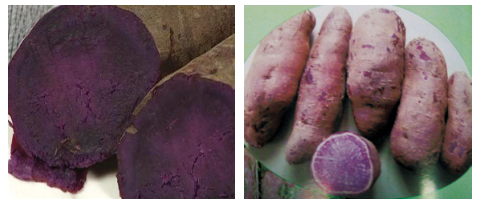 特征特性 : 株形半直立,中长蔓,分枝多。顶叶绿色带紫边,叶形心带齿,叶脉、茎均为绿色;结薯集中,单枝结薯数较多;薯形纺锤,薯皮、薯肉均为紫色,花青素含量高,薯身光滑,薯块较均匀。薯块干物率 33.88% ~ 35.55%,食味分 78.0 ~ 78.1 分, 淀 粉 率 22.18% ~ 28.60%, 花 青 素 含 量46.97 ~ 80.82 毫克 /100 克鲜薯。耐贮性好。大田和室内薯瘟病抗性鉴定均表现为中抗。