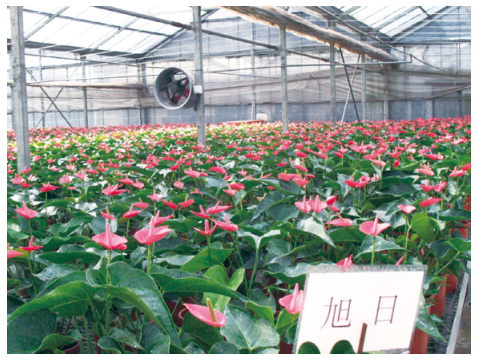 特征特性 : 旭日红掌,株型较紧凑,平均株高 32.1 厘米,冠幅 50.5 厘米。叶片近三角形,新叶带有斑纹,后渐变为浓绿色 ;佛焰苞长 8.7 厘米,宽 6.6 厘米,鲜红色,光泽度好,花期长,且花色保持不变;以 2/3 雌蕊成熟为标准观察花序颜色,上中下部分别为灰红色、橙红色、红色;从组培小苗出瓶到开花成品约需 18 个月。与对照品种粉冠军相比,花期长,花色稳定不变。栽培试验结果表明,其抗逆性较强,适应性好。