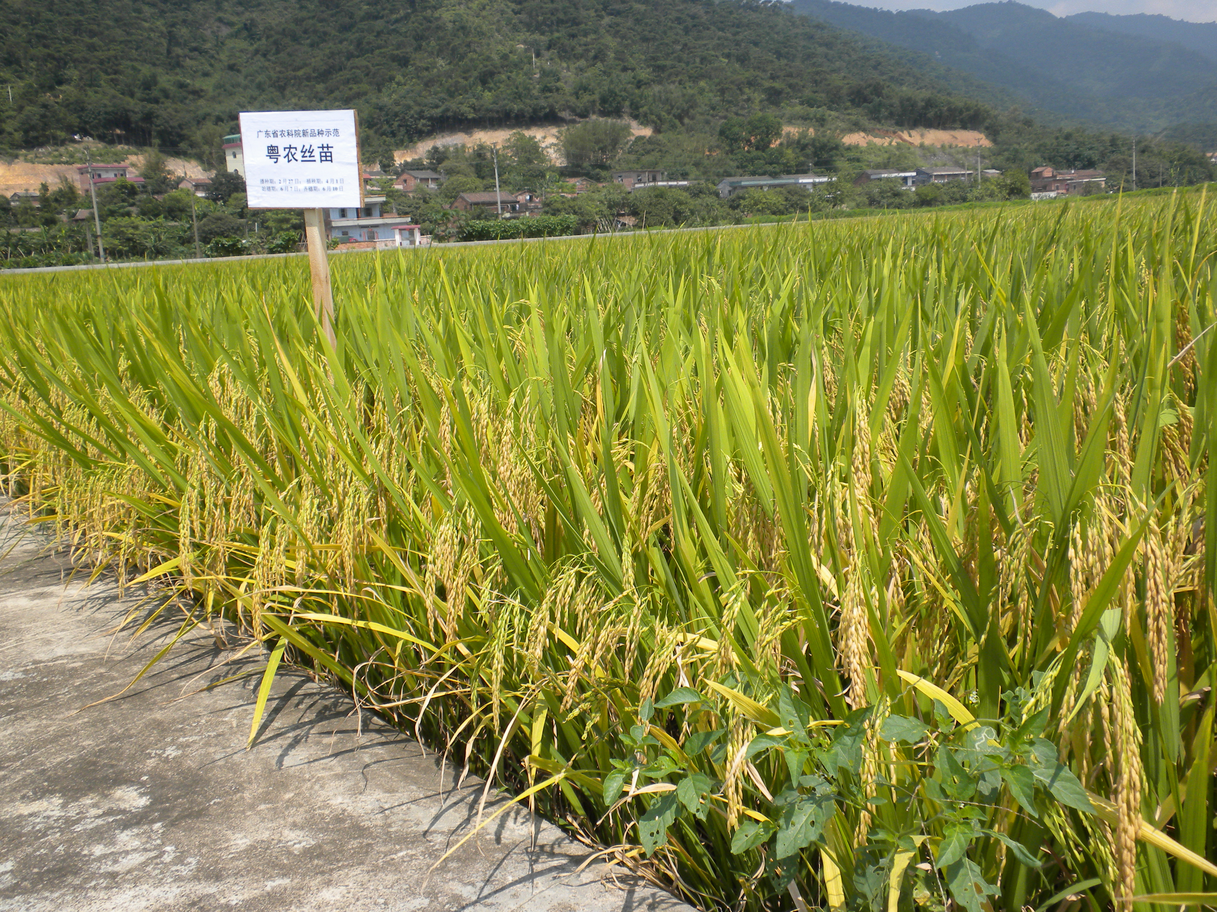 主要农艺性状好:粤农丝苗属早、晚两用型感温中迟熟常规水稻品种,早造全生育期128天,晚造全生育期111天,比粳籼89早熟1-2天。该品种株型紧凑,株高适中,分蘖力中等,叶色绿,叶姿中直。科高97.0-97.9厘米,穗长21.3-21.4厘米,亩有效穗19.4-19.7万穗,每穗总粒数122-124粒,结实率87.1-88.0%,千粒重22.0-22.6克。