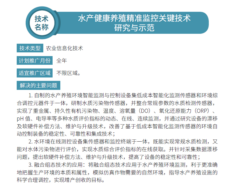 2019年主推技术:水产健康养殖精准监控关键技术 研究与示范