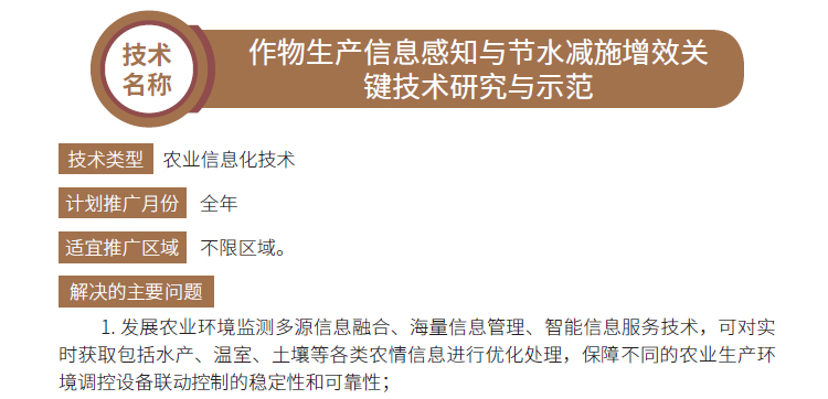 2019年主推技术:作物生产信息感知与节水减施增效关键技术研究与示范