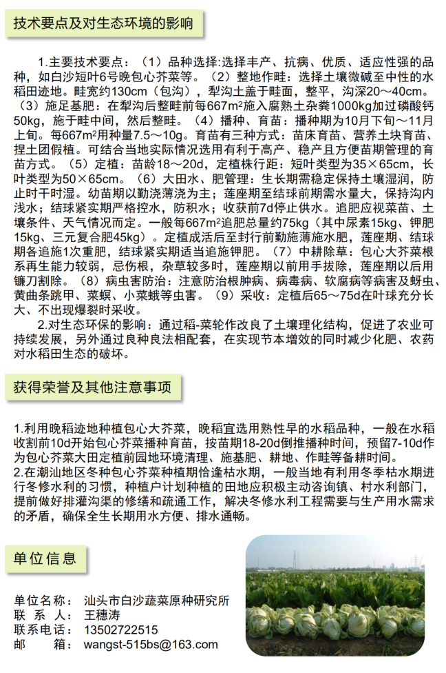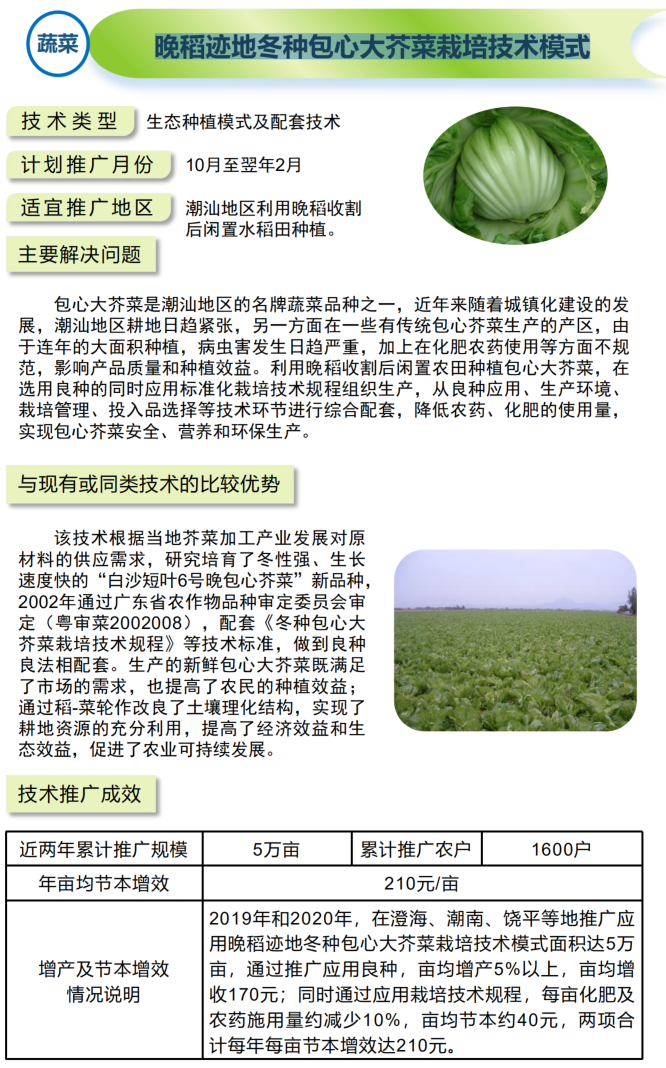 2021年农业主推技术:晚稻迹地冬种包心大芥菜栽培技术模式