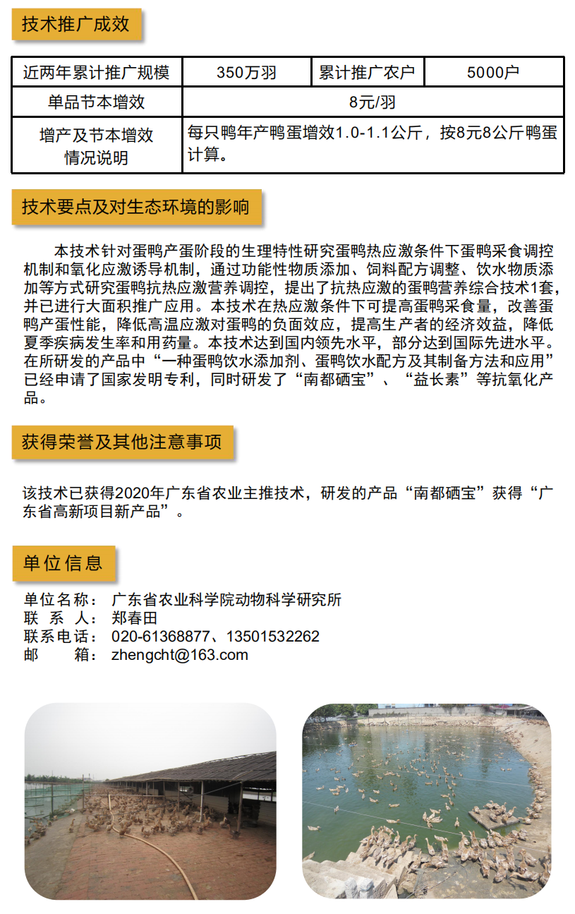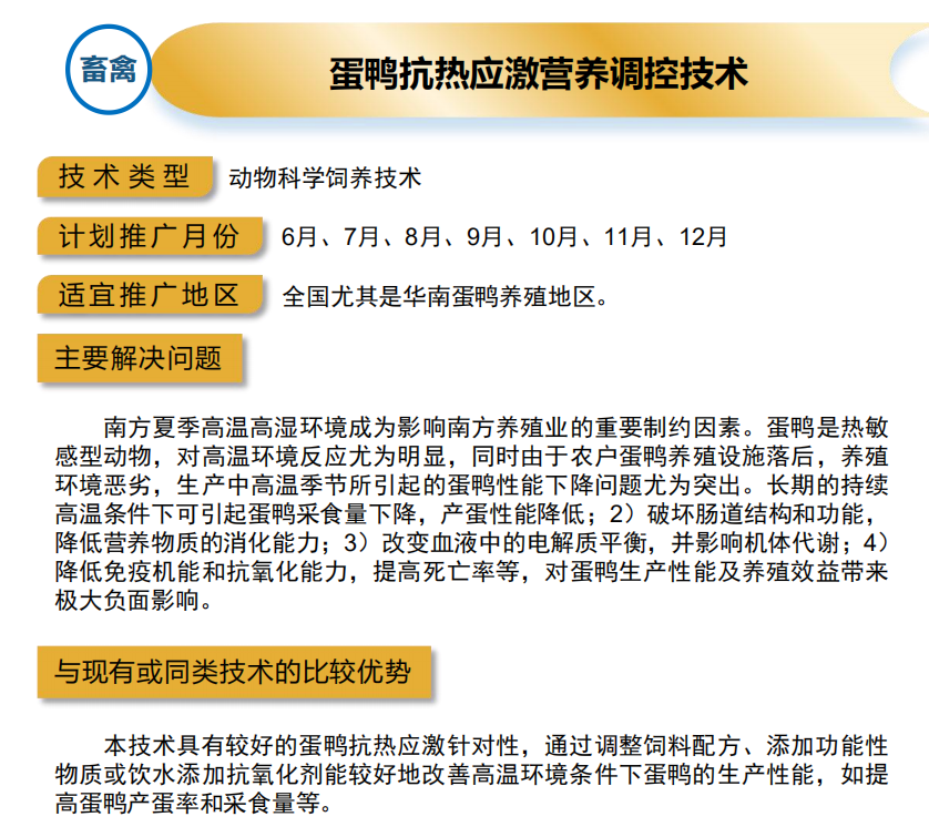 2021年农业主推技术:蛋鸭抗热应激营养调控技术