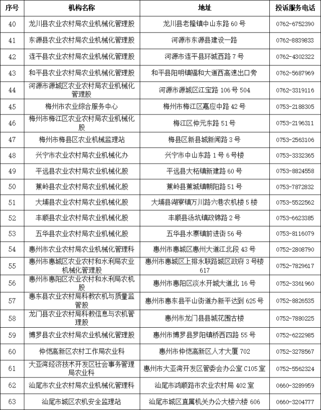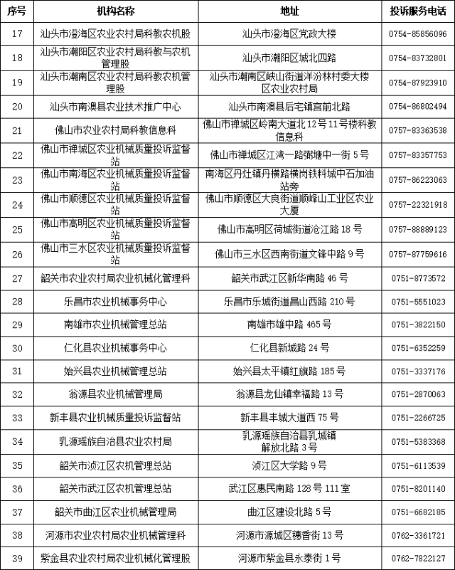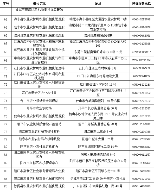 广东省、市、县(市、区)农机质量投诉监督机构信息表