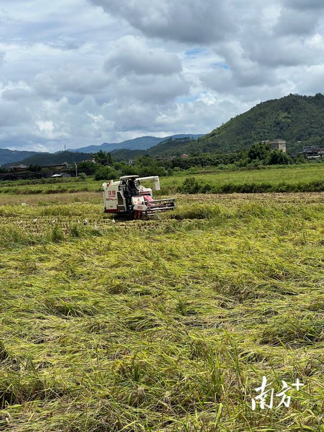 在汕尾市陆丰市,陆丰支农农机专业合作社的社员们冒着暑热出门、进田,抢收。合作社负责人颜裕裎介绍,今年,合作社早稻种植面积3000余亩,受台风影响,2~4成稻田出现倒伏情况,目前收割400~500亩。