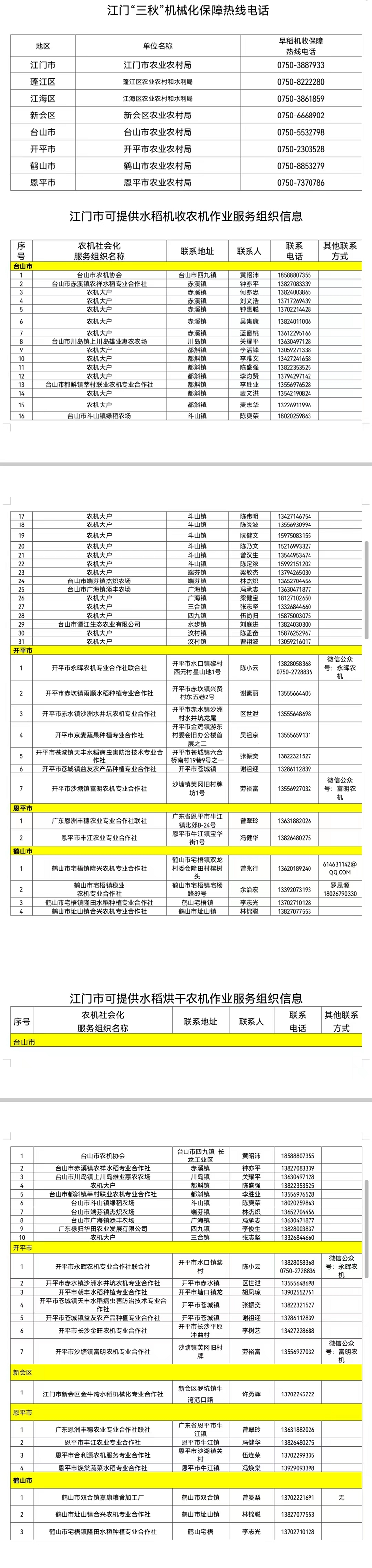 江门市公布“三秋”农机保障热线及水稻机收、烘干作业社会化服务信息