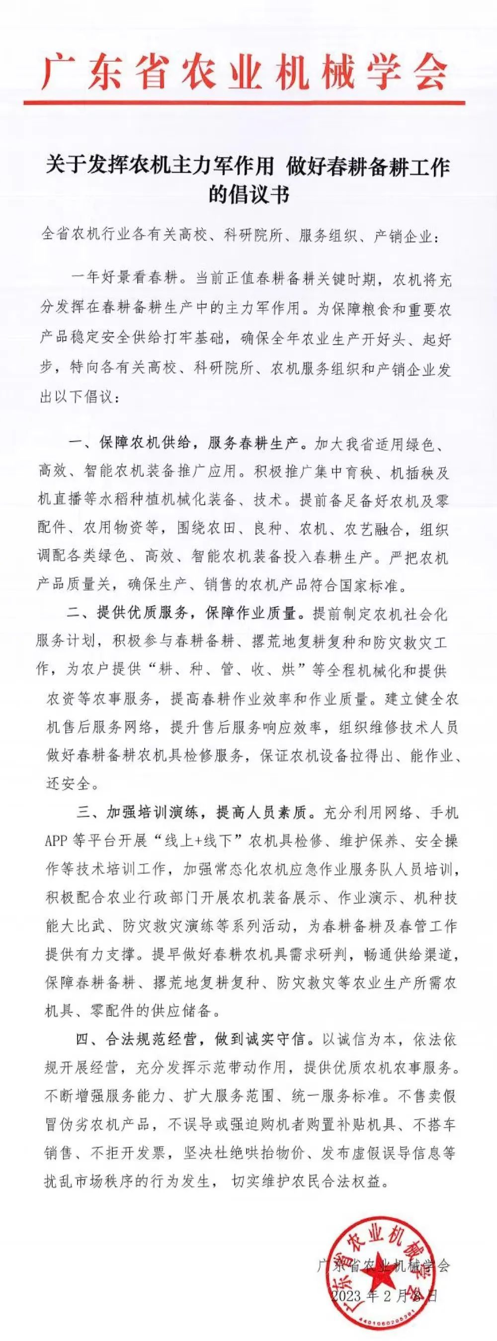 季节不等人,春日胜黄金。当前,正值春耕备耕关键时期,广东省农业机械学会于2月8日向全省农机行业各有关高校、科研院所、服务组织、产销企业发出倡议书,共同做好保障农机供给、提供优质服务、加强培训演练、合法规范经营等方面工作。