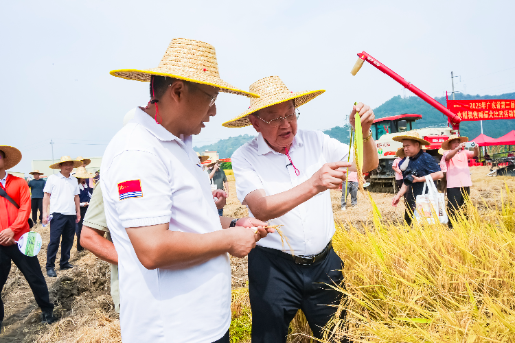 收割现场,中国工程院院士、华南农业大学教授罗锡文走进田间地头,仔细察看今年水稻长势,与团队成员交流种植技术。“我们的农场水稻今天测产,显示亩产干谷553.1公斤,高于平均水平,这是良种、良法、良机相结合的结果。”广东省丝苗香米科技创新中心主任、华南农业大学农学院教授唐湘如说。