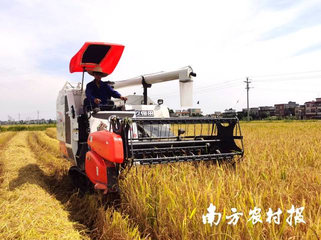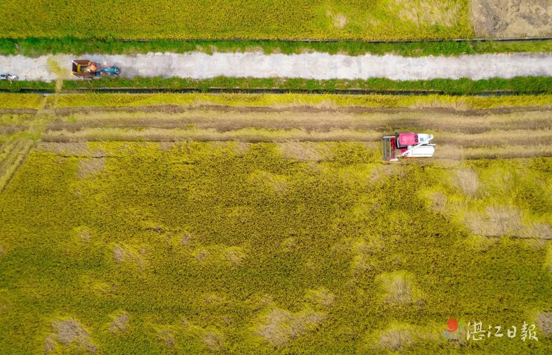 6月22日下午,记者在“广东第一田”雷州东西洋主产区的稻田看到一台台水稻收割机正开足马力往返穿梭田间,有条不紊地进行着收割工作。一片片稻田经过收割机的处理,金黄饱满的稻谷被送到装载粮食的车厢里稻浪滚滚,颗粒归仓,农民脸上洋溢着丰收的喜悦。