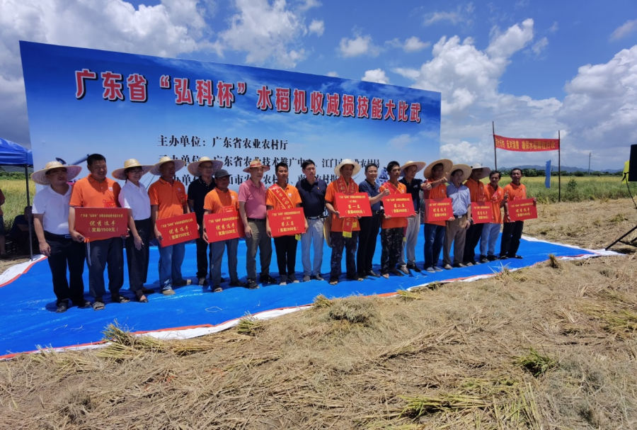 七月的江门,满目金黄, 稻菽飘香,丰收在望。“广东省’弘科杯’水稻机收减损技能大比武活动”珠江三角洲区域赛区,于7月5日在江门台山市广海镇进行,这是全省田间节粮减损实战大比武的第一场。