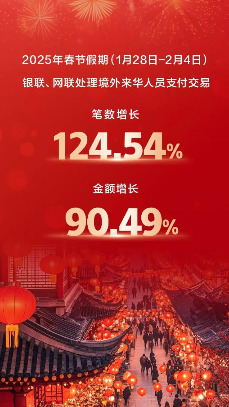 中国人民银行最新发布的数据显示,蛇年春节假期(1月28日至2月4日),银联、网联共处理境外来华人员支付交易笔数较去年春节假期增长124.54%,交易金额增长90.49%。