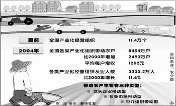 “十五“期间,农业产业化经营快速发展。农业部农业产业化办公室常务副主任黄连贵介绍,截至2004年底,全国产业化经营组织已发展到11.4万个,龙头企业销售收入达14261亿元,分别比2000年增长70.9%和141.7%。