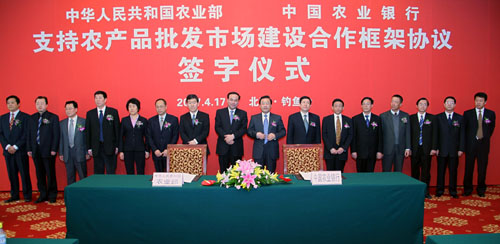 农业部与中国农业银行17日签署“共同支持农产品批发市场建设合作框架协议”,以促进我国农产品市场体系现代化建设。