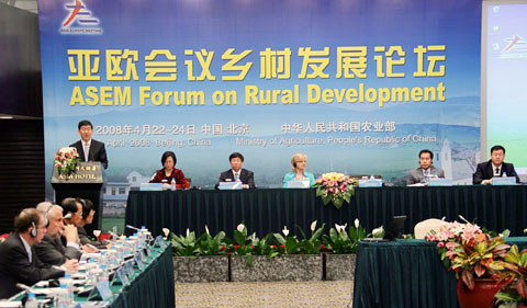 4月22日至24日,亚欧会议乡村发展论坛在北京召开,旨在促进亚欧会议成员加强乡村发展领域的政策对话,相互借鉴乡村发展的政策措施和经验,促进亚欧国家开展乡村发展方面的交流与合作。开幕式上,中国农业部副部长牛盾、立陶宛农业部副部长佐斯塔蒂尼、菲律宾土地改革部副部长玛杜罗分别代表中国、欧洲国家和亚洲国家致辞,亚欧会议35个成员的有关官员和专家120多人参加了论坛。