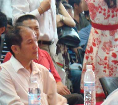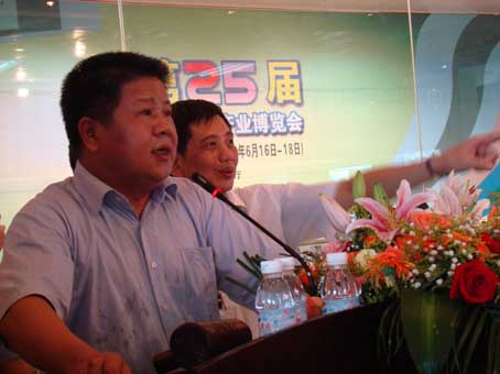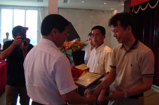 广东省农业厅副厅长、广东省畜牧兽医局局长陈福林为得奖养猪户颁奖