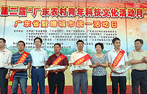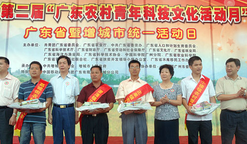 为深入贯彻党的十七大和广东省委十届二次全会精神,落实省委、省政府关于“双转移”工作的具体行动,为新农村建设培养“有文化、懂技术、会经营”的新型农村青年人才,推动我省区域经济协调发展,积极发挥农村青年生力军作用,由共青团广东省委员会、广东省农业厅、广东省科技厅等十六个厅局级单位联合主办的第二届“广东农村青年科技文化活动月”广东省暨增城市统一活动日于2008年6月18日上午在增城市增城广场举行。