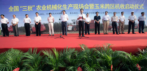 农业部副部长张桃林在讲话时说,今年上半年全国农机总动力达7.86亿千瓦,比去年底增长2.3%;机耕、机播、机收总面积达14.5亿亩,耕种收综合机械化水平达43.8%,比去年提高1.3个百分点。“三夏”小麦跨区机收克服了柴油供应偏紧等不利因素,实现了快打快收、颗粒归仓,投入机具总量、参加跨区作业机车数、机收作业面积、机收水平和效益均创历史最高水平,减少粮食损失约24.6亿公斤,增加机手纯收入26亿元,节省种粮农民人工费用38亿元。