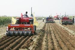 8月29日,从农业部在山东济南召开的全国“三秋”农业机械化生产现场会暨玉米跨区机收启动仪式上获悉,今年“三秋”农业机械化生产以作业机具稳步增长、作业水平不断提高、作业市场稳定有序为目标,以狠抓水稻、玉米机收,秸秆机械粉碎还田,小麦、油菜机播以及农机抗灾减灾作业为重点,力争投入机具总量增加100万台套,达到2600万台套以上;玉米机收水平提高3个百分点,突破10%;水稻机收水平提高5个百分点,越过50%;小麦机播水平提高2个百分点,超过80%;油菜、马铃薯等作物的机械化播种取得明显进展。