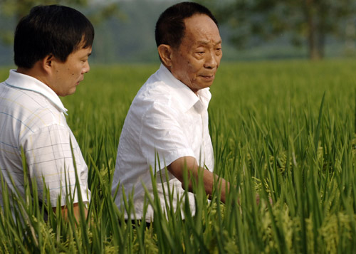 8月31日,袁隆平院士在安徽合肥超级杂交稻“种三产四”示范基地考察。 由袁隆平院士组织实施的超级杂交稻“种三产四”丰产工程,自2007年开始实施以来,今年在安徽、四川等粮食主产区稳步推进。该项目计划将于2010年在全国推广6000万亩,等于增加了2000万亩粮食耕地,可多养活3000多万人。“种三产四”丰产工程,是袁隆平院士2006年提出的,其主要内容是运用超级杂交稻的技术成果,力争用3亩地产出现有4亩地的粮食,以此提高粮食产量,节余土地。