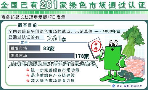 房爱卿指出,培育绿色市场是实施三绿工程的核心内容。近年来,商务部和各地流通主管部门积极开展绿色市场培育工作,并取得了初步成效。绿色市场严把市场准入关口,使不合格产品在绿色市场无立足之地;通过鼓励“场地挂钩”、“场厂挂钩”,合理引导农产品生产种植,有效解决卖难问题;并设置优质农产品专卖区域,加快产销衔接,增加了农民收入,促进了消费的升级和扩大。同时,绿色市场高度重视环境保护,提倡节约资源,对废弃物进行分类处理和再生利用,促进循环经济发展。截至目前,全国共培育争创绿色市场的试点、示范单位4000多家,已通过认证的达261家,其中批发市场83家,零售市场178家。北京市已通过认证的绿色市场达19家。