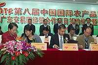 以“转变发展方式,推进现代农业”为主题的第八届中国国际农产品交易会,于2010年10月19日在河南省郑州市郑州国际会展中心隆重开幕。广东省组织了37家重点农业龙头企业,500多种名优产品参展。广东展团首日即获大丰收,在期间举行的重大经贸合作项目成交签约仪式上实现签约45.2亿元。李容根副省长出席签约仪式并讲话,省农业厅厅长谢悦新作广东参展情况介绍。