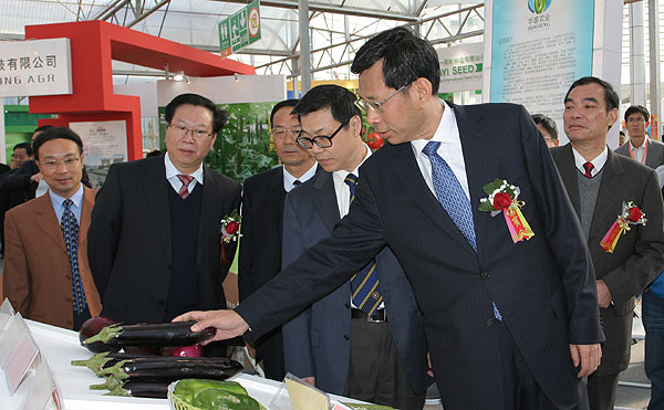 副省长刘昆(前)察看广东种业博览会企业展位。