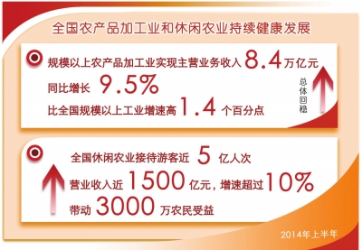 围绕建设美丽乡村,休闲农业规范有序发展。将发展休闲农业与文化传承、生态涵养、创意产业和现代农业建设融为一体。开展农业文化遗产挖掘保护,成立了专家委员会,认定并发布了20个中国重要农业文化遗产,制定了保护管理办法,推进农耕文明、民俗文化、景观资源的动态传承;向社会推介了10个中国最美乡村和108个中国美丽田园;开展了全国休闲农业与乡村旅游示范县和示范点创建活动;开展了全国休闲农业创意精品推介活动,集中展示4000余件创意精品,推动创意产业发展;启动制定休闲农业行业标准,推进休闲农业融资服务。据不完全统计,上半年全国休闲农业接待游客近5亿人次,营业收入近1500亿元,增速超过10%,带动3000万农民受益。