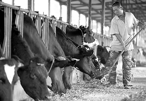 9月24日,河北省永清县北辛溜乡鑫昊奶牛场工人在给奶牛喂食粉碎的玉米秸秆。