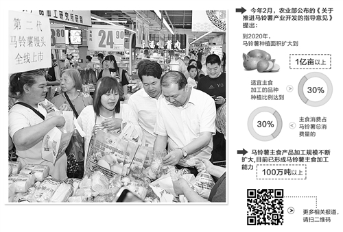 今年2月,农业部公布了《关于推进马铃薯产业开发的指导意见》,提出把马铃薯作为主食产品进行产业化开发。到2020年,马铃薯种植面积扩大到1亿亩以上,适宜主食加工的品种种植比例达到30%,主食消费占马铃薯总消费量的30%。