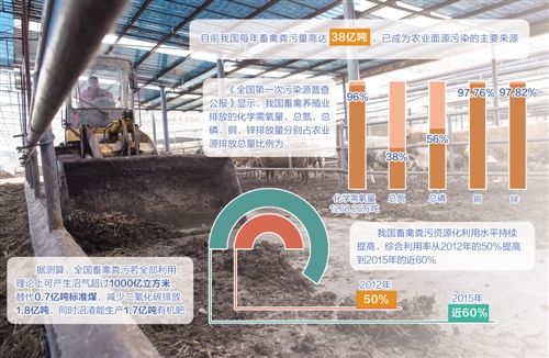 经过多年努力,我国畜禽粪污资源化利用已取得了明显成效。2015年畜禽养殖化学需氧量、氨氮排放量比2010年分别降低132万吨和10万吨,降幅达11.5%和15.4%,超额完成“十二五”时期的减排目标。从畜禽粪便资源化利用情况看,在政策支持和市场倒逼下,粪污处理设施设备不断完善,治理机制逐步健全,畜禽粪污资源化利用水平持续提高,综合利用率从2012年的50%提高到2015年的近60%,对改善和提高城乡居民生产生活环境作出了积极贡献。