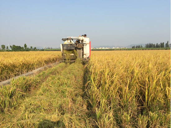 11月,晚稻进入收割期。50多岁的张红清站在田埂边,看着两台收割机在自己金灿灿的水稻田里来回作业,两亩半水稻田,很快完成收割和脱粒装袋。她说:“现在干农活,连地都不用下去了。”
