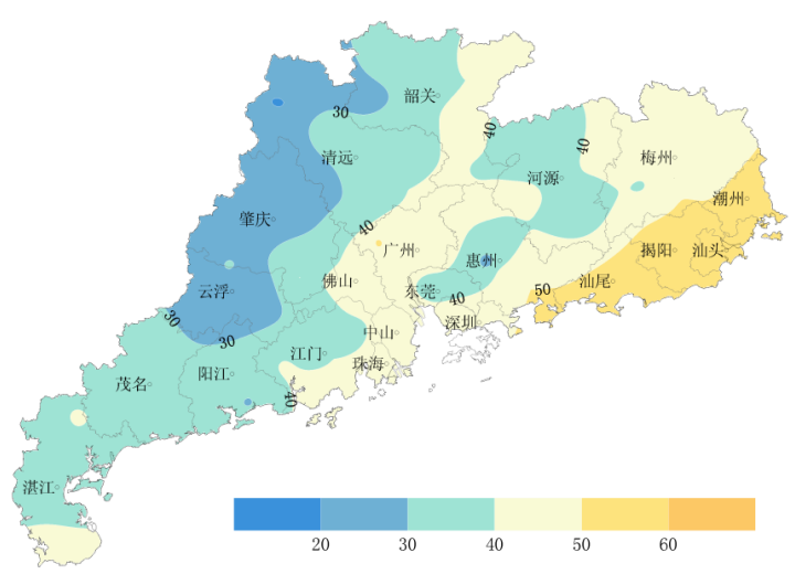 上周(12月4~10日),全省平均气温15.6℃,与常年持平,北部地区12.0~14.0℃,西南、珠江口两侧地区16.0~19.1℃,其余地区14.0~16.0℃,中东部大部正常到偏低1.8℃,其余地区正常到偏高1.1℃(图1)。平均日照时数40.2小时,与常年持平,但分布不均,中部偏东和东部大部平均日照时数40.0~59.5小时,其余地区平均日照时数19.1~40.0小时(图2)。全省平均累积降水量0.3毫米,较常年同期偏少9成以上,71%的站点周内无降水。目前,广东省荔枝、龙眼处于控梢期,春植蕉主要处于营养生长期,少数处于挂果期或可采成熟期,甘蔗处于收获期。上周温度、日照正常,降水显著偏少,光热条件利于冬种蔬菜生长、甘蔗糖分累积及蕉柑柑果膨大,但降水持续偏少,对无灌溉设施的在田作物生长及水库蓄水有不利影响。根据气象干旱监测,东南大部、中部、阳江地区出现大面积轻度气象干旱,南澳、河源、紫金、五华地区出现中度气象干旱,需持续关注。