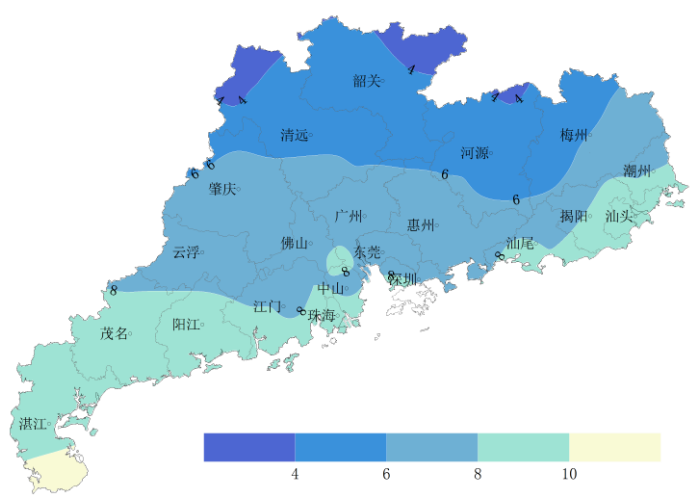 预计,6日大部分地区晴到多云;7日中北部地区云量增多;6~7日大部分地区早晚气温低,其中,中北部地区早晨有5℃以下的低温,高寒山区零下4℃左右。8日,全省大部分地区多云到晴,气温回升,粤北仍有5℃低温。9日,东部地区多云到阴天有小雨,其余地区多云间阴天为主。10~11日,受中等冷空气影响,西部地区多云到阴天有分散小雨,东部地区阴天有小雨。