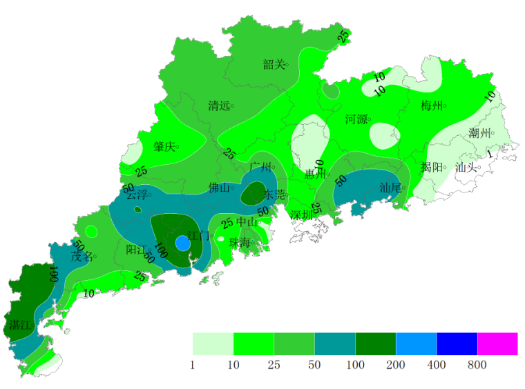 上周(4月30~5月6日),全省平均气温25.8℃,其中北部23.3~25.0℃,茂名局部、雷州半岛27.0~27.5℃,其余大部分地区25.0~27.0℃。与常年同期相比,全省平均偏高1.6℃,其中东部大部偏高1.5~3.1℃,其余大部分地区偏高1.0~1.5℃(图1);全省平均累计降水量35.3毫米,较常年同期偏少3成,降水主要集中在广州-佛山-江门-云浮一线及汕尾和湛江地区,为50~150毫米(恩平256毫米、番禺169.9毫米),东部大部为25毫米以下,其余大部分地区为25~50毫米(图2),与常年同期相比,全省大部分地区降水偏少3成~1倍;全省平均累计日照时数28.9小时,与常年同期持平,其中西北大部7.2~20小时,西南大部和南部沿海30~57.5小时,其余地区20~30小时。