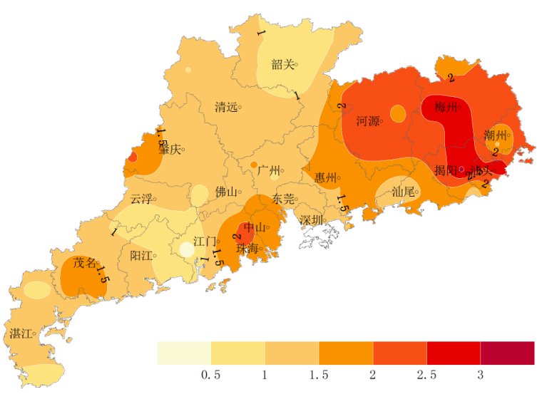 目前全省早稻大部分地区仍处于分蘖普遍期,阳江、梅县和广宁已进入拔节普遍期;花生大部分地区为下针普遍期,高要处于开花普遍期;荔枝、龙眼为果实发育期;沙田柚为幼果膨大期。上周我省气温偏高、降水偏少、日照正常,除东部偏东地区外,周内我省大部分地区出现了阵雨,局部大到暴雨或大暴雨降水。温高光足的天气条件有利于水稻分蘖及无效分蘖的控制,也利于蔬果类作物光合作用的开展,且周内出现的降水有效抑制了除东部地区外,其他地区气象干旱的发展。根据气象干旱监测显示,目前有13个站出现轻旱,7个站出现中旱,9个站出现重旱,4个站出现特旱(图3)。