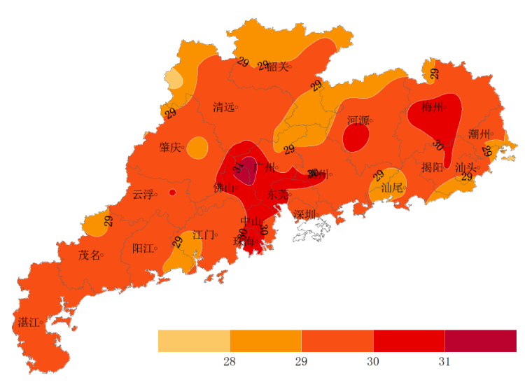 上周(5月21-27日),全省平均气温29.5℃,较常年同期偏高3.7℃,珠江口两岸、梅州、河源局部30.0~31.5℃,北部偏北和沿海局部27.7~29.0℃,其余大部分地区29.0~30.0℃(图1),与常年同期相比,北部大部和广佛局部偏高4.0~5.4℃,西南大部偏高2.1~3.0℃,其余大部分地区偏高3.0~4.0℃(图2),74%的站点平或破有记录以来同期最高值记录,22%的站点成为同期第二高记录;全省平均累计降水量仅9.8毫米,较常年同期偏少84%,降水分布不均,新丰、连山、珠海、鹤山降水量为42.7~47.2毫米,其周边地区为20.4~29.2毫米,大部分地区小于10毫米,11个站无降水;全省平均累计日照时数64.3小时,较常年同期偏多1.3倍,南部沿海70~77.9小时,西北偏北43.4~60小时,其余大部60~70小时。