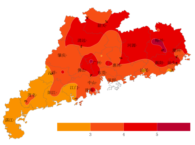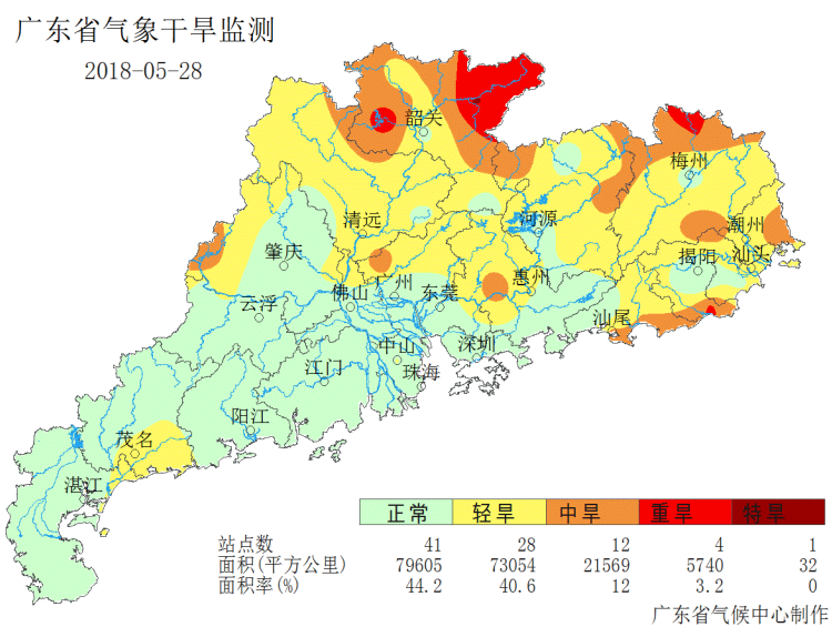 目前广东省早稻信宜、中山、从化、潮阳、广宁处于孕穗期,徐闻、梅县进度较快,已处于抽穗普遍期,其余大部分地区处于拔节期;花生为下针普遍期;荔枝、龙眼处于果实发育~成熟采摘期;柑橘、沙田柚为幼果膨大期。上周全省气温显著偏高、日照显著偏多、降水明显偏少,周内温高光足,利于早稻孕穗抽穗及其他作物生长;虽然大部无降水,但前期外部水源充足,对农业用水影响不大。周内主要农事活动有早稻肥水管理、作物病虫害防治、喷药施肥、田间除草等。根据气象干旱监测显示,目前北部和东部气象干旱略有抬头,全省轻旱站点28个、中旱站点12个、重旱站点4个、特旱站点1个(图3)。