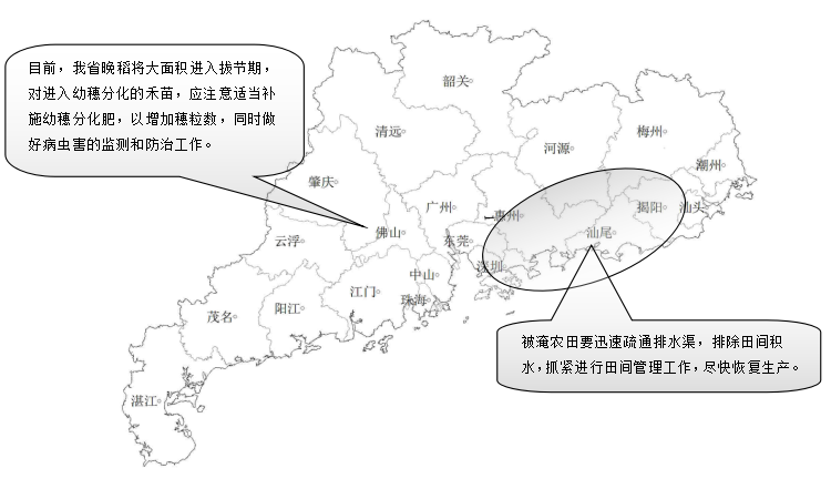 目前,我省晚稻将大面积进入拔节期,对进入幼穗分化的禾苗,应注意适当补施幼穗分化肥,以增加穗粒数,同时做好病虫害的监测和防治工作;部分受灾地区被淹农田要迅速疏通排水渠,排除田间积水,抓紧进行田间管理工作,尽快恢复生产;龙眼摘果后注意清园、施肥;柑桔进入果实膨大期,应保证充足的肥水供给;本周末到下周我省南部沿海地区和中部局部有降水过程,各地注意抓紧有利时机进行各项农事活动,田间工作注意安全。(图3)。