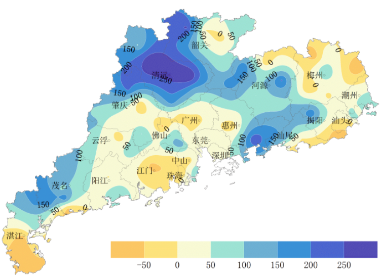 本周(8月31~9月6日),全省平均气温27.4℃,较常年同期偏低0.4℃;全省降水量85.2毫米(图1),较常年同期偏多5成,其中,茂名、清远、河源、汕尾局部地区偏多1~3倍,湛江南部、江门局部、梅州局部、潮州局部偏少4~8成,其余大部分地区正常~偏多1倍(图2);全省日照时数34.1小时,较常年同期偏少18%。