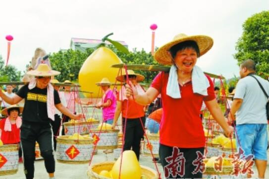 梅州大埔双髻山蜜柚公园广场上,柚农挑着刚采摘下来的蜜柚。大埔县供图