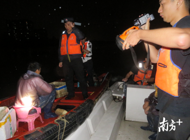 执法人员迅速登船向可疑船舶火速前进,并使用探照灯对目标进行锁定。在灯光照射下,一艘橙色纤维船舶突然掉头加速向中山方向逃离,企图摆脱执法船艇。执法船艇对违法船只一路紧跟,执法人员一边用探照灯将其锁定,一边严正责令船上人员停船接受检查。