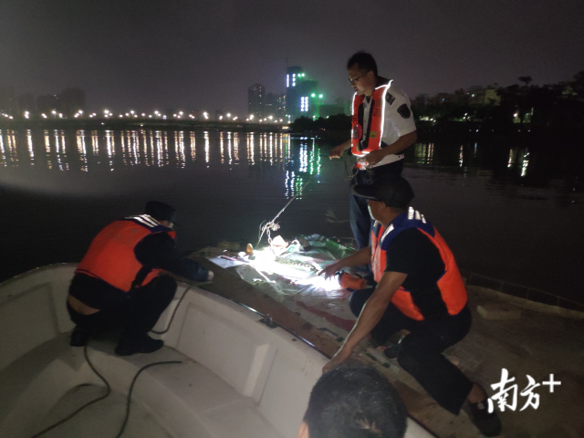 大队人员根据网络直播视频,摸清了不法分子作案时间和地点规律,5月6日晚上21时,6名执法人员冒雨在前山河格力电器工厂对开岸边静待守候。21时40分,一艘可疑船舶从前山河中珠交界水域驶来,并在格力电器对开水域一边刺网捕捞,一边打开灯光进行网络直播。