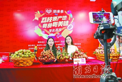 在2020年中国荔枝产业大会的配套活动“荔枝原产地 粤食粤美味”直播中,两位主播正在推介新鲜采摘的茂名荔枝。岑稳 摄