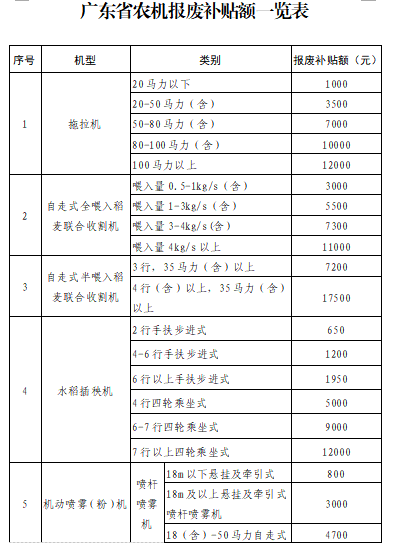 今年农机报废更新补贴在全国范围内首次由试点转为全面实施,广东省从2020年起开展农业机械报废更新补贴工作。