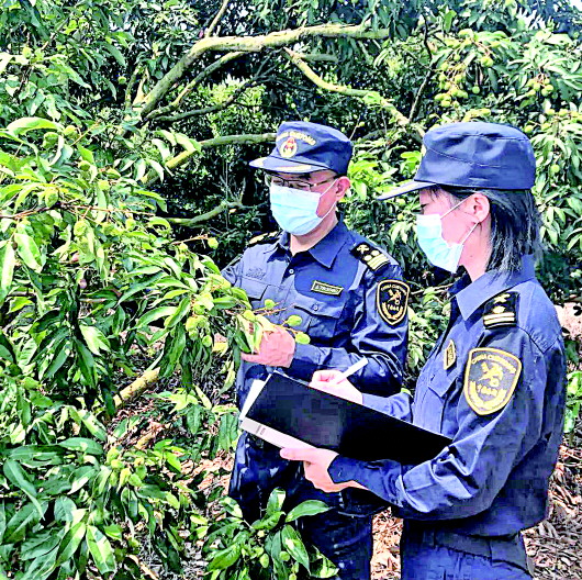 海关工作人员从荔枝授粉到成熟,都会定期到果园实施监管,实地排查病虫害、农药残留等质量安全风险,帮助果园完善质量管理体系,还会经常进行果品检测。