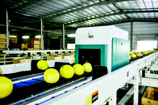 一个个柚果放在分选流水线上过一遍“X光”,测量糖度、水分等指标,然后选择达标的统一装箱,消费者开箱以后吃到的每一个水果,它不仅大小一致,口味也一致,果品分选分级后的直接效果显而易见。