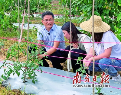 “现在温度比较高,有些圣女果树落花情况比较严重,需要适当加水,更好地保花保果……”湛江市遂溪县界炮镇圣女果基地,广东省农业技术推广总站站长林绿一边观察着生长中的圣女果树,一边进行现场指导。