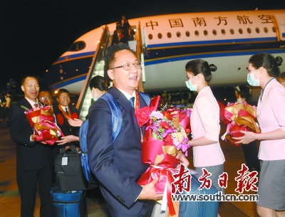 2月25日傍晚,广州白云国际机场CZ3104航班飞机缓缓驶入停机坪。在全国脱贫攻坚总结表彰大会上受表彰的广东先进个人和先进集体代表有序走出飞机舱门。