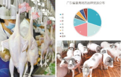 广东有着培育地方特色优质种畜禽品种的潜力。《国家畜禽遗传资源品种名录》显示,我国现存地方猪品种共83个,其中广东占4个:大花白猪、蓝塘猪、粤东黑猪和小耳花猪。广东省有6个黄羽肉鸡地方品种被收入中国畜禽遗传资源志的地方品种资源,分别为清远鸡、惠阳胡须鸡、封开杏花鸡、信宜怀乡鸡、阳山鸡、中山沙栏鸡。